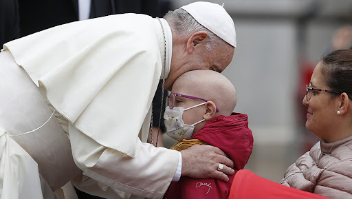 Papa Francisco abraça um menino doente durante sua audiência geral na Praça de São Pedro, no Vaticano Oct. 17. (CNS photo/Paul Haring) See POPE-AUDIENCE-KILL Oct. 17, 2018.