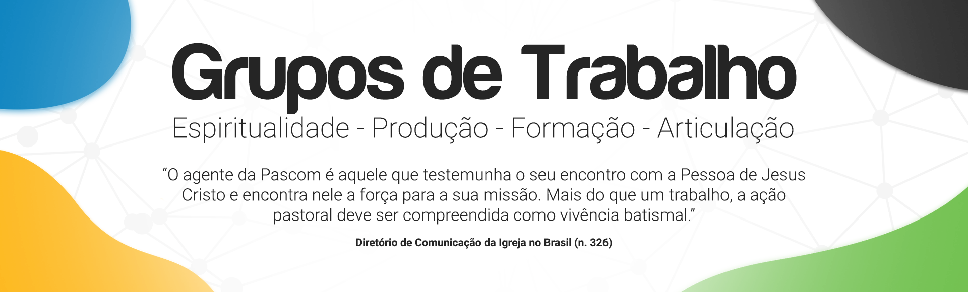 Os Grupos de Trabalho (GTs) se consolidam como um caminho de participação e melhor desenvolvimento das atividades da Pascom Brasil. Cada GT corresponde a um eixo da Pascom e é composto por coordenadores regionais e assessores eclesiásticos, membros da Coordenação Nacional, e também conta com colaboradores pasconeiros de diversas realidades do Brasil.
